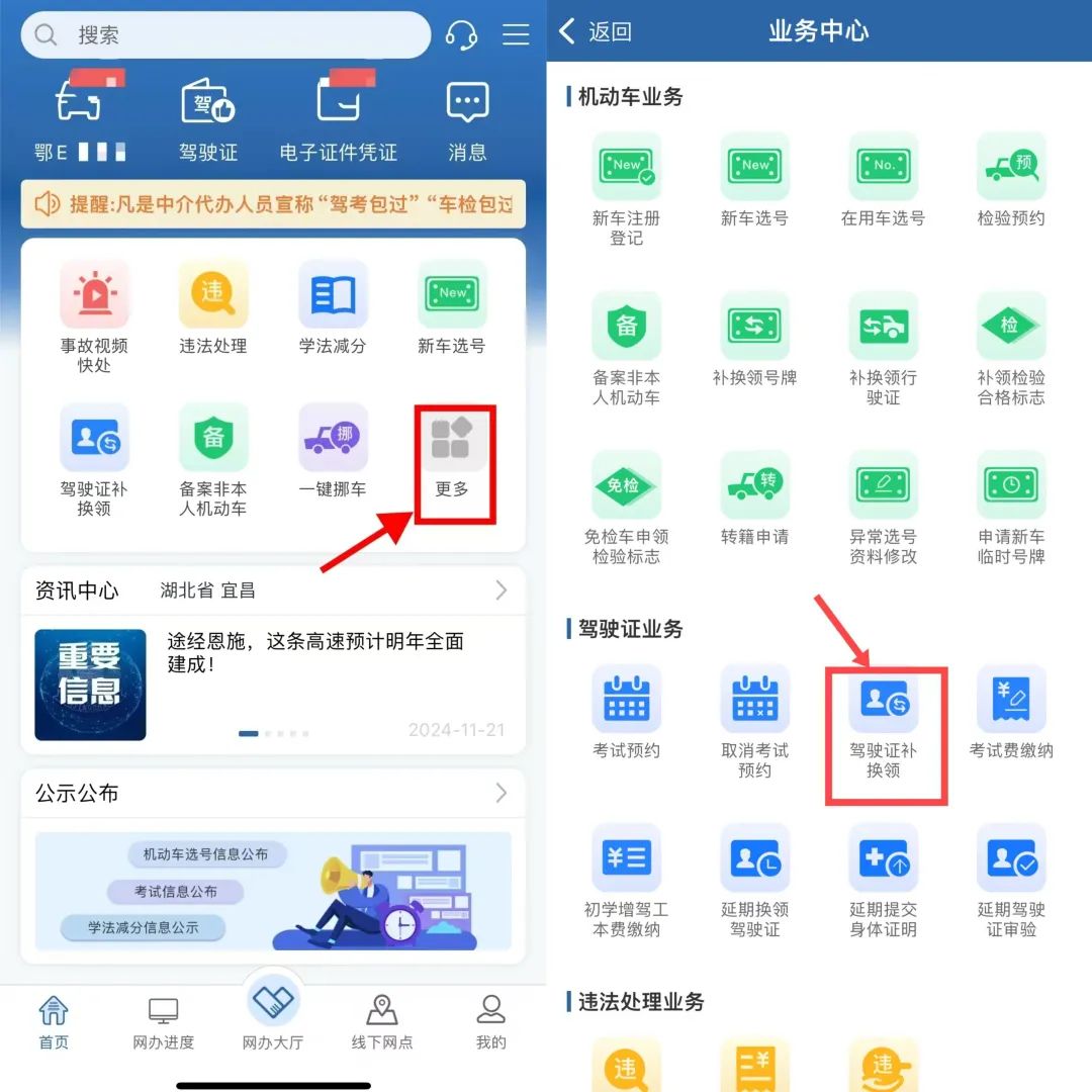 首頁點擊“更多”→業(yè)務(wù)中心→駕駛證業(yè)務(wù)→駕駛證補換領(lǐng)→ 勾選【期滿換證】,根據(jù)相關(guān)提示進行操作即可。
