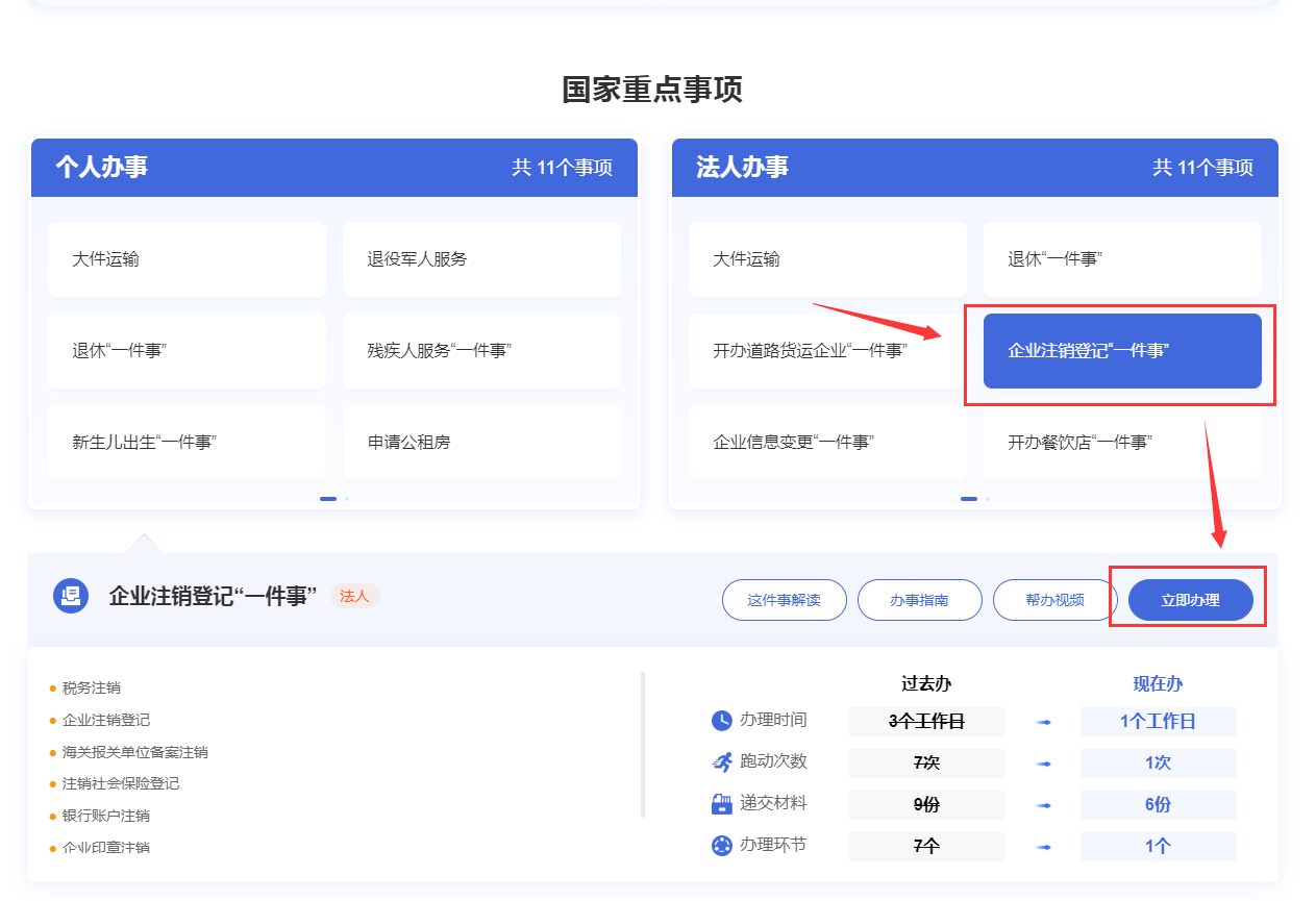 2.在國家重點事項板塊找到開辦【企業注銷登記“一件事”】,點擊進入然后點擊【立即辦理】。