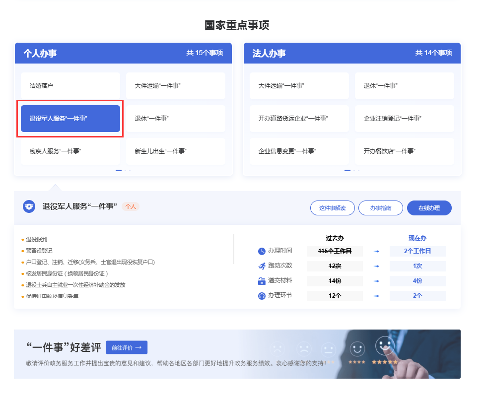 1.進入申報。進入湖北政務服務網(http://zwfw.hubei.gov.cn/?areaId=420500000000)“高效辦成一件事”專區,在“國家重點事項”--“個人辦事”中點擊“退役軍人服務‘一件事’”,點擊“在線辦理”選擇對應區劃進行申報。