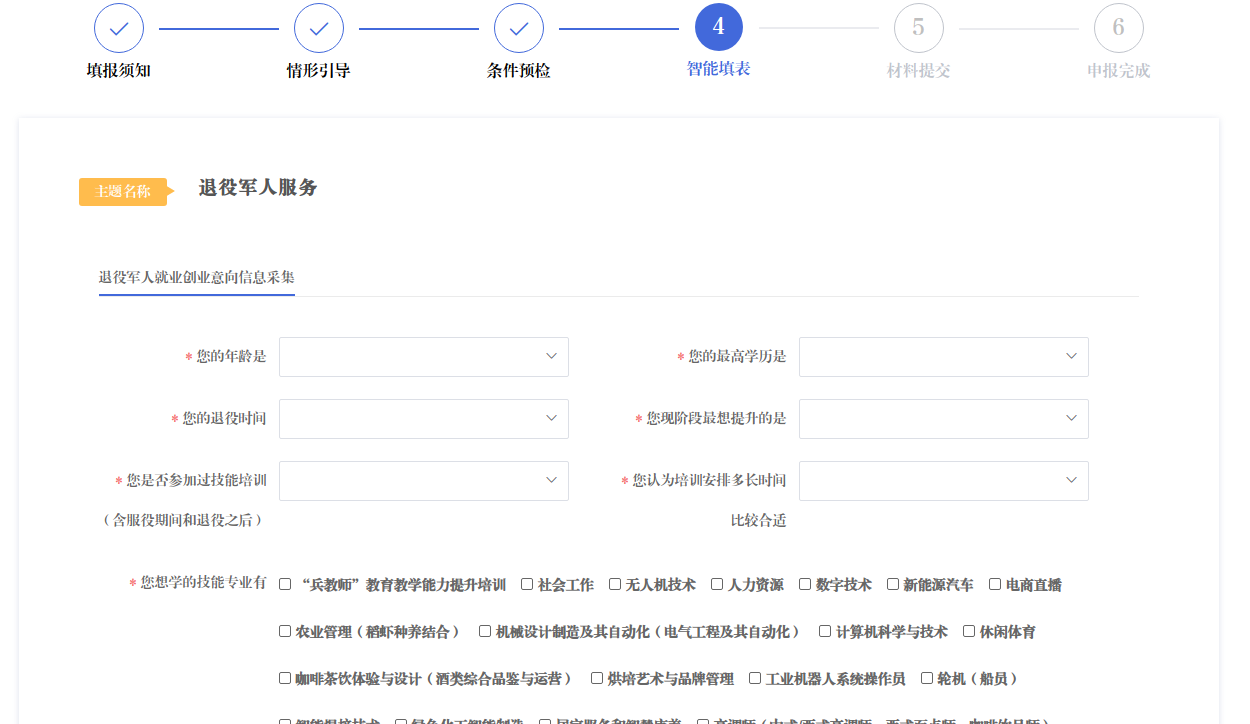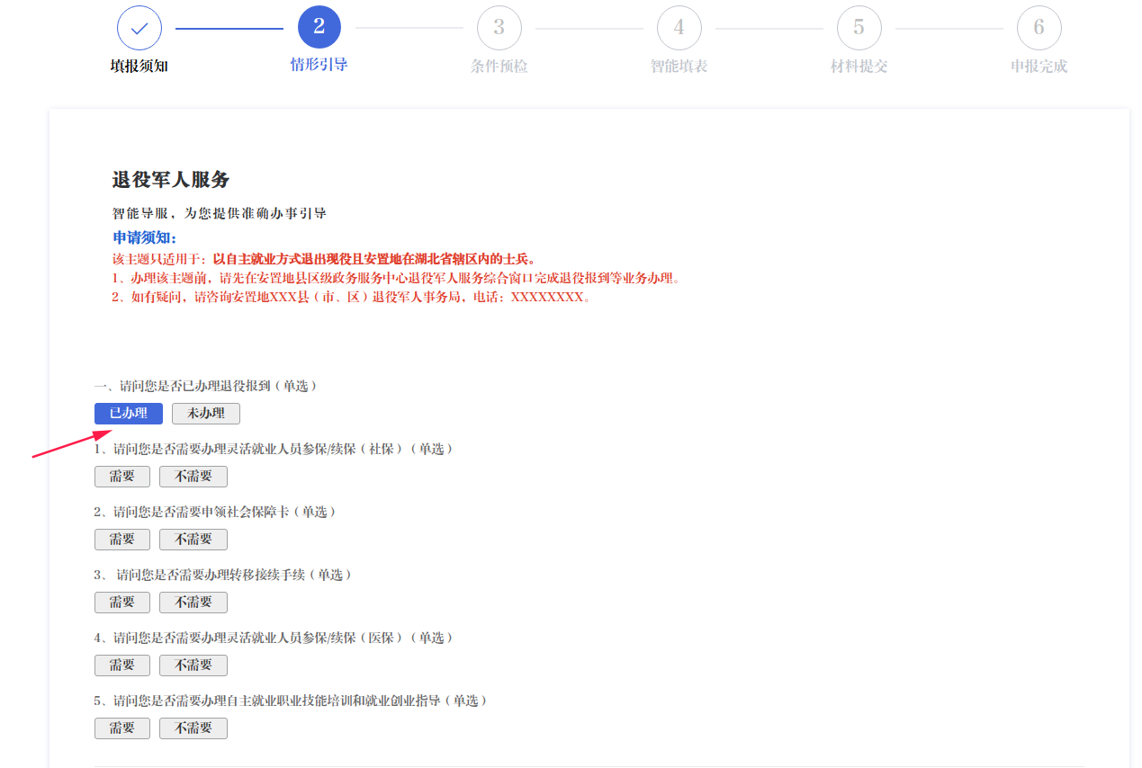 3.情形引導。辦理人員完成退役報到后根據自身實際情況,智能引導選擇完成對應情形選項。