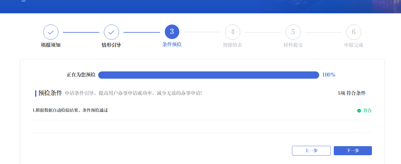 4.條件預檢。完成引導選擇后,點擊“下一步”,就會進入到一件事的條件預檢頁面,校驗用戶是否符合該一件事辦理條件。