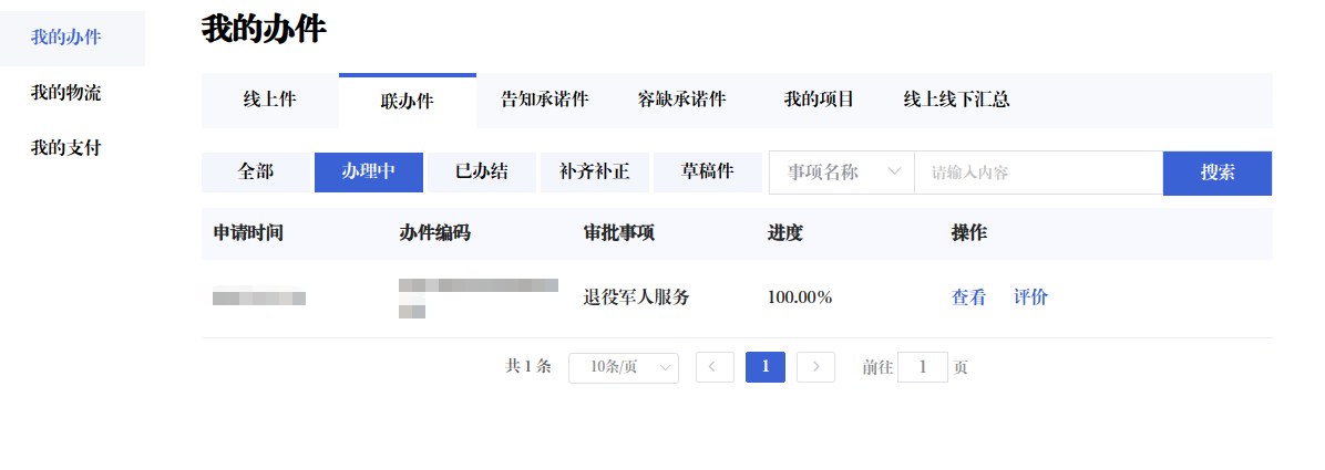 7.申報完成。完成一表填報、材料上傳,提交成功生成聯辦件編碼。查詢辦件進度。辦理人員提交完成“退役軍人服務一件事”主題申報后,可通過個人專屬空間(用戶空間)查看辦件進度情況。點擊“我的辦事”,查看“聯辦件”,根據“申請時間”、“辦件編碼”、“審批事項”查看辦件進度。