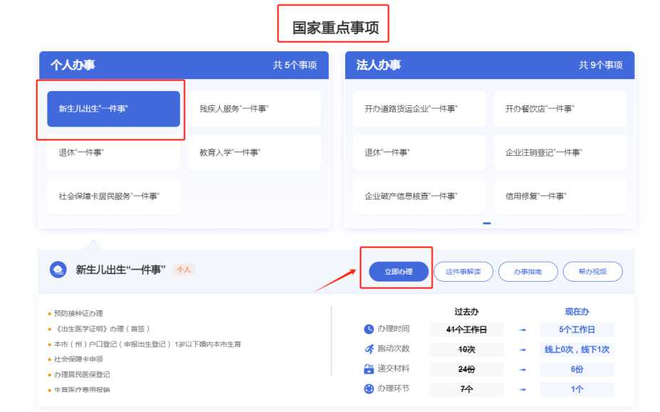 ④在“國(guó)家重點(diǎn)事項(xiàng)”中找到新生兒出生“一件事”,點(diǎn)擊“立即辦理”選擇辦理區(qū)域,按照提示引導(dǎo),逐步辦理。