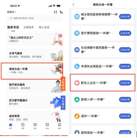 ②在APP首頁(yè)服務(wù)專區(qū)中選擇“高效辦成一件事”專欄。找到新生兒出生 “一件事”主題,點(diǎn)擊“在線辦理” 可以進(jìn)?主題解讀查看該一件事改革前后成效、辦理流程、辦理材料、相關(guān)政策等;如需辦理主題,點(diǎn)擊“立即辦理”按鈕。