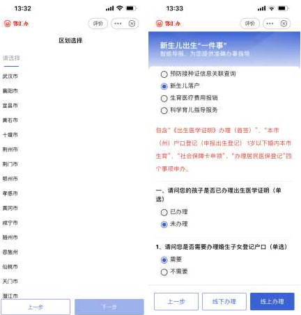 ③辦理人員根據(jù)自身實(shí)際情況,選擇辦理區(qū)域。根據(jù)引導(dǎo)問(wèn)題,選擇對(duì)應(yīng)事項(xiàng),點(diǎn)擊“線上辦理”。依次填報(bào)相關(guān)申報(bào)信息,根據(jù)相關(guān)提示上傳相應(yīng)材料(免交材料已獲取無(wú)須上傳),點(diǎn)擊“下一步”即可完成申報(bào)。