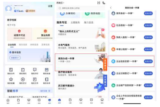 ① 打開鄂匯辦APP,找到我的——點擊登錄(填寫信息進行法人信息注冊并登錄)——點擊“首頁”——進入服務專區——選擇高效辦成一件事——選擇企業信息變更“一件事”——點擊“在線辦理”。