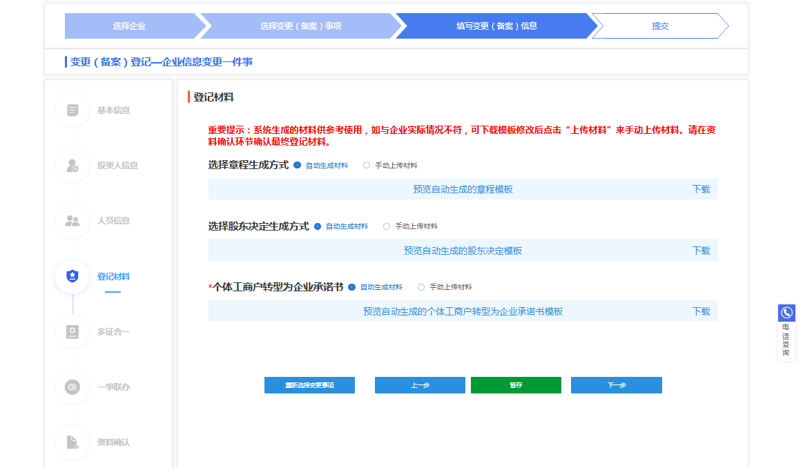 登記材料中根據轉型升級的企業類型以及人員信息需上傳或系統生成企業對應的章程、股東決定等。同時新增了個體工商戶轉型為企業承諾書。填報受益所有人信息。