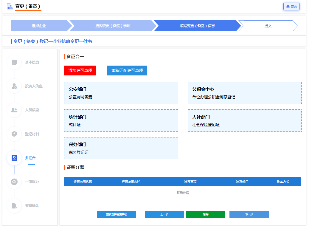 多證合一頁面中,展示企業登記涉及的許可事項以及證照分離事項。