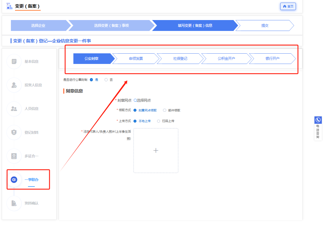 一事聯辦頁面中,可選擇填報公安刻章、申領發票、社保登記、公積金開戶、銀行開戶信息。經營主體根據實際情況選擇是否聯辦對應事項。