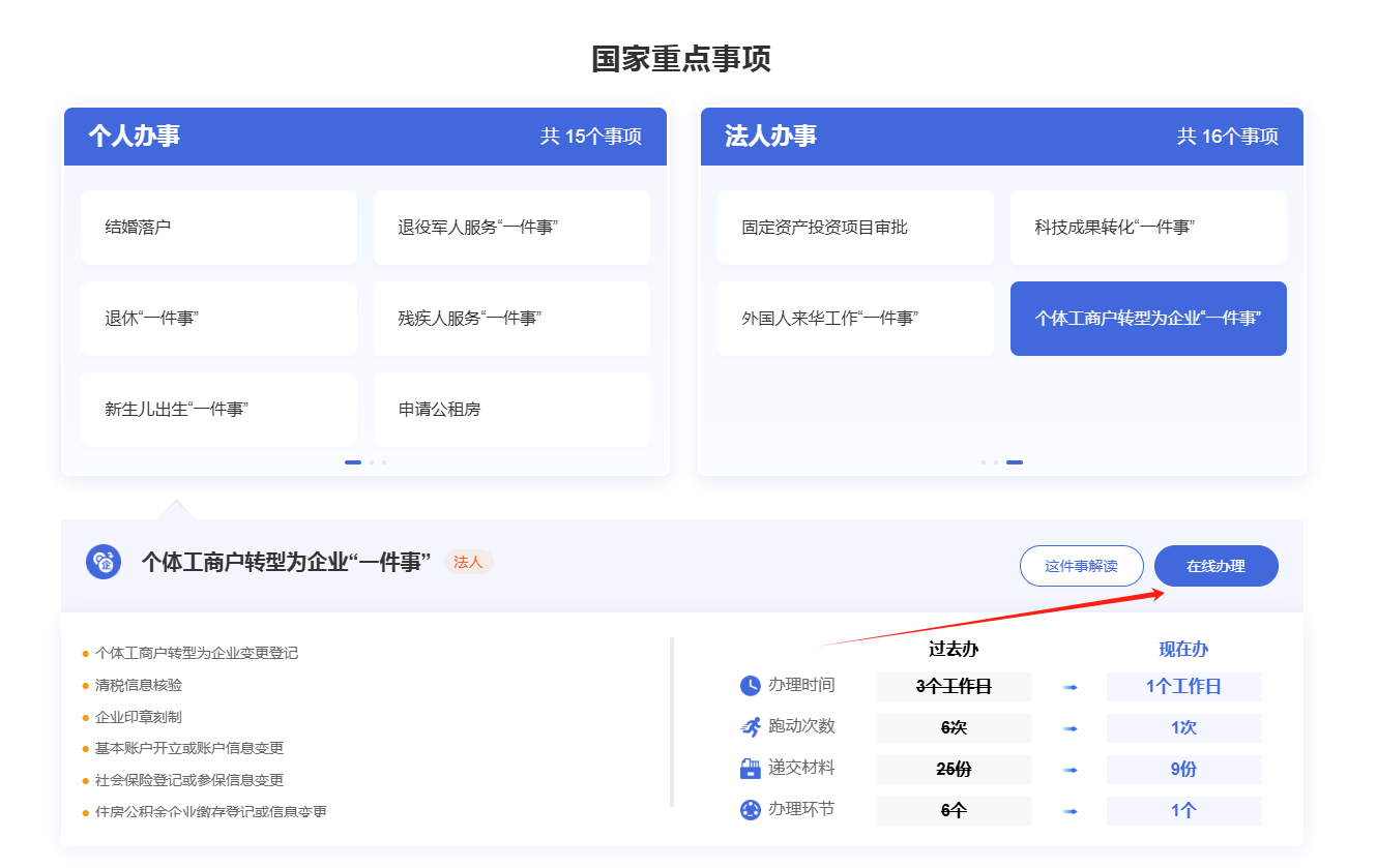 (二)登錄后,在首頁特色專區中點擊進去“高效辦成一件事專區”,選擇個體工商戶轉型為企業“一件事”在線辦理