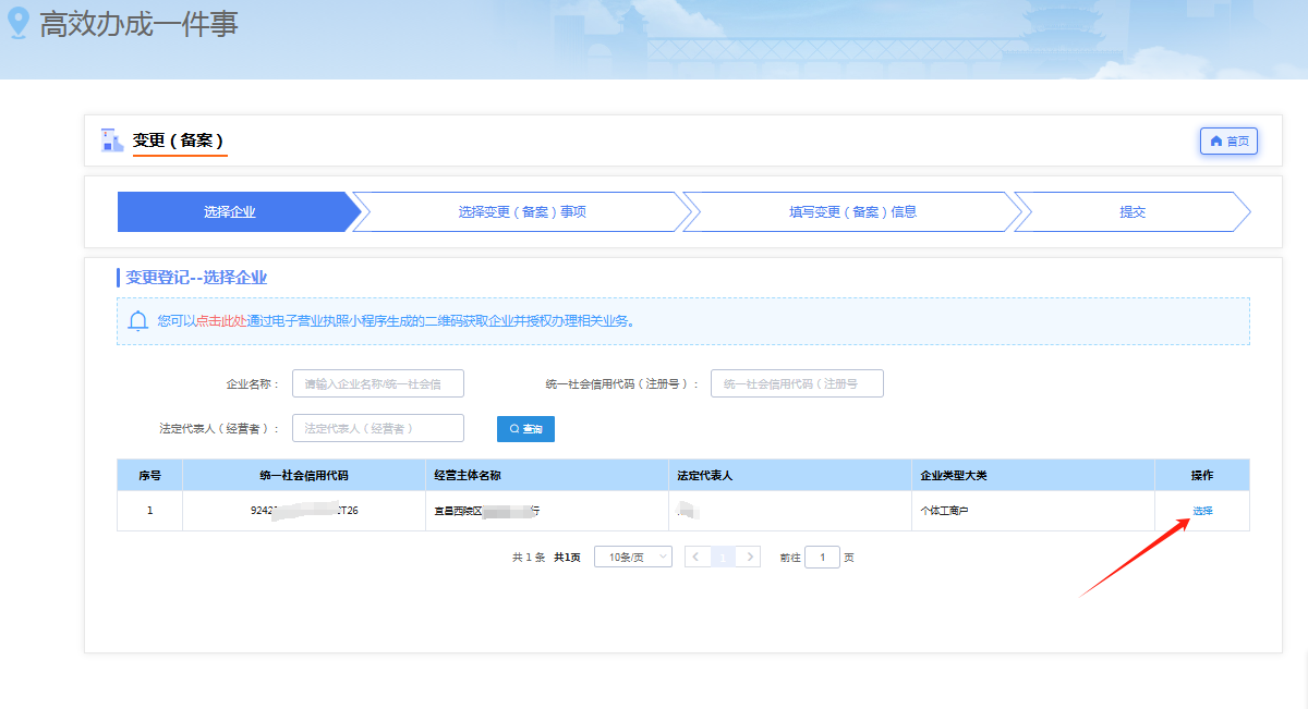 1.選擇經營主體。首先選擇經營主體住所所在區域,再查找需個轉企的個體工商戶,點擊“選擇”。