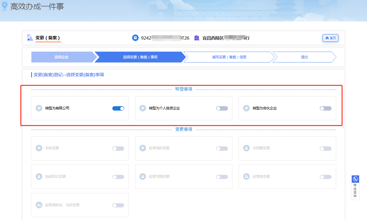 2、選擇轉型事項。轉型事項中選擇:有限公司、個人獨資企業、合伙企業三種類型。