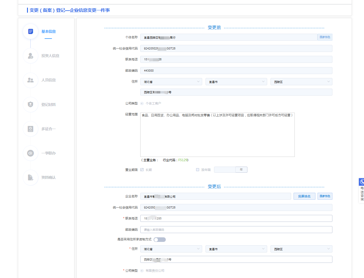 以轉型為有限公司為例。變更前展示原個體工商戶基本信息(包含:個體名稱、 統一社會信用代碼、聯系電話、郵政編碼、住所、公司類型、經營范圍、營業期限)
