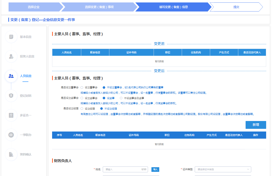 主要人員(董監高)變更前該個體戶無對應人員數據,因此暫無數據。變更后的董監高人員信息,根據經營主體實際情況進行填報。董監高人員信息錄入完成后,錄入財務負責人、聯絡員信息、委托代理人信息。