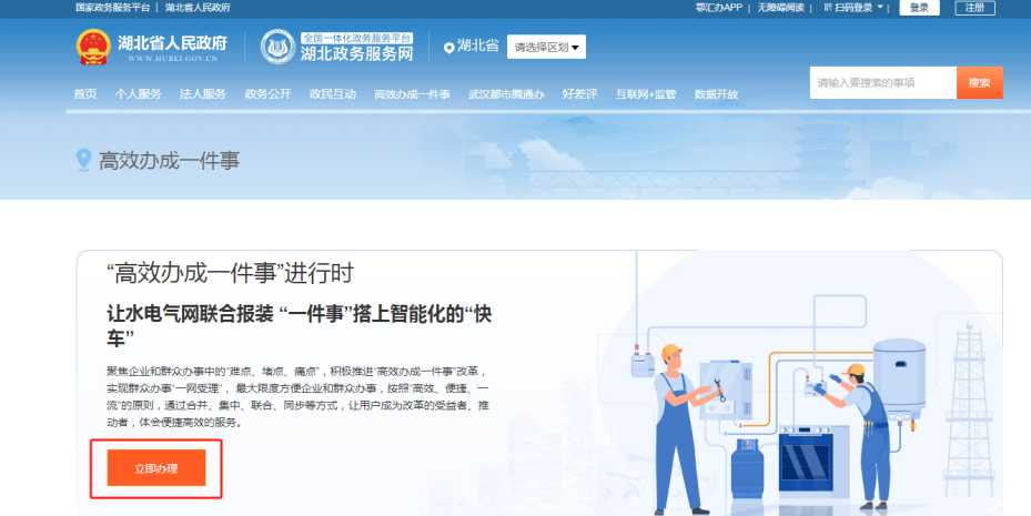 ③首頁點擊“高效辦成?件事”,選擇“企業全生命周期”—水電?網聯合報裝“?件事”,點擊“立即辦理”,選擇區域(宜昌市)進?省市協同專區申報界?。