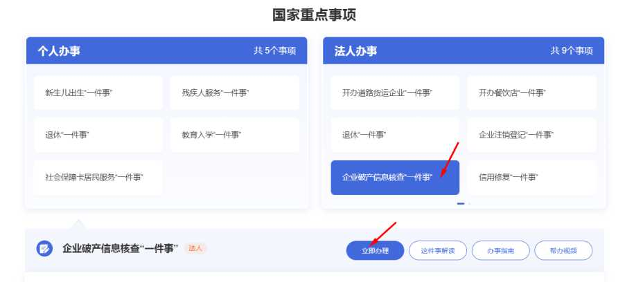 ④在國家重點事項板塊找到“企業破產信息核查一件事”,點擊進入,然后點擊“立即辦理”,申請人根據自身實際情況,選擇辦理區域,按照提示引導,逐步辦理。