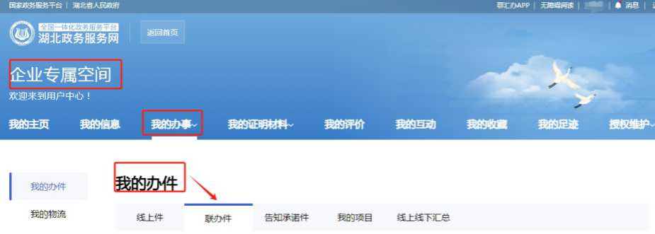 ⑤如何查詢辦件進度。辦理人員提交完成企業破產信息核查“一件事”主題申報信息后,可通過個人專屬空間(用戶空間)查看辦件進度情況。點擊“我的辦事”,查看“聯辦件”,根據“申請時間”“辦件編碼”“審批事項”查看辦件進度。