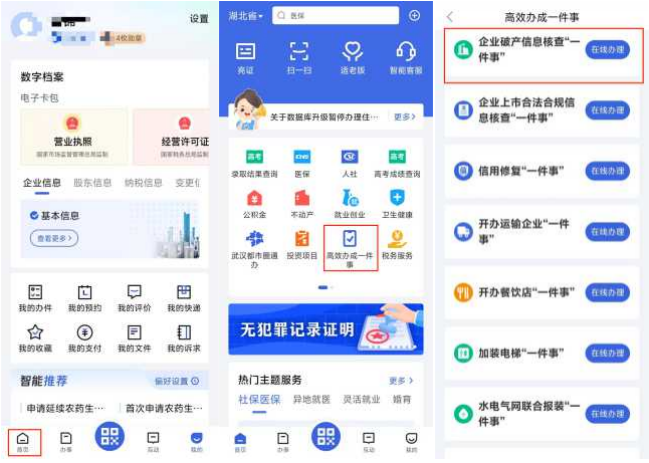 打開湖北政務服務網(http://zwfw.hubei.gov.cn/),首頁選擇“高效辦成一件事”專欄,在國家重點事項板塊找到“企業破產信息核查一件事”,點擊進入,然后點擊“立即辦理”,申請人根據自身實際情況,選擇辦理區域,按照提示引導,逐步辦理。