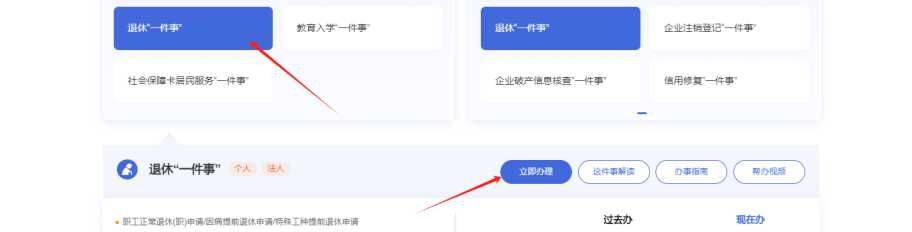 ④在國家重點事項板塊找到退休“一件事”,點擊進入,再點擊“立即辦理”,申請人根據自身實際情況,選擇辦理區域,按照提示引導,逐步辦理。