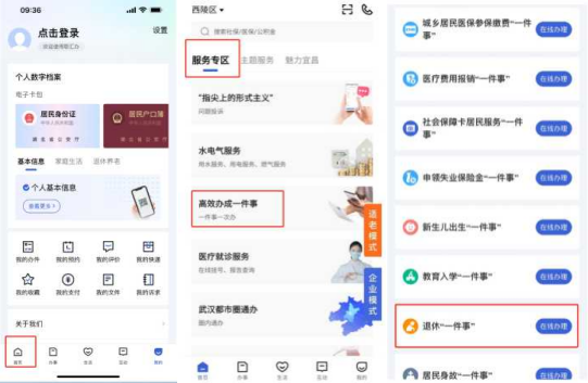 ①打開鄂匯辦APP,找到我的點擊登錄(填寫信息進行個人信息注冊并登錄)——點擊“首頁”—進入服務專區——選擇高效辦成一件事——選擇退休“一件事”——點擊“在線辦理”
